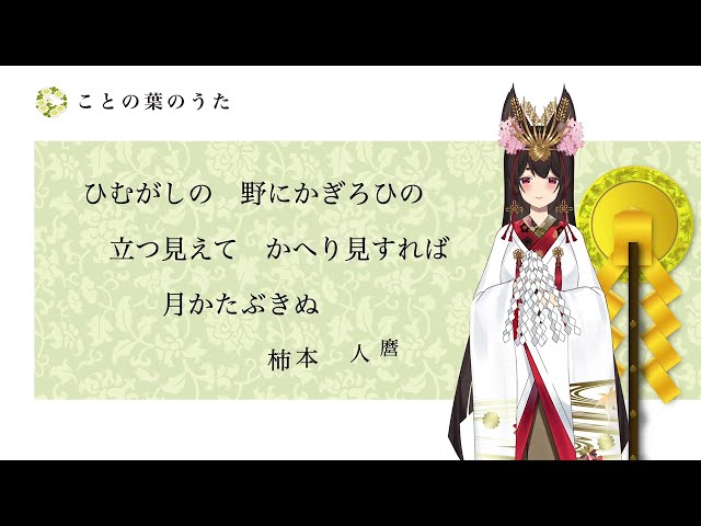ひむがしの 野にかぎろひの 立つ見えて かへり見すれば 月かたぶきぬ 柿本 人麿 ( かきのもと の ひとまろ ) [ 首の意味 ] 首の意は、東の野の果てに曙光がさしそめて、その時、西の方をふりか…