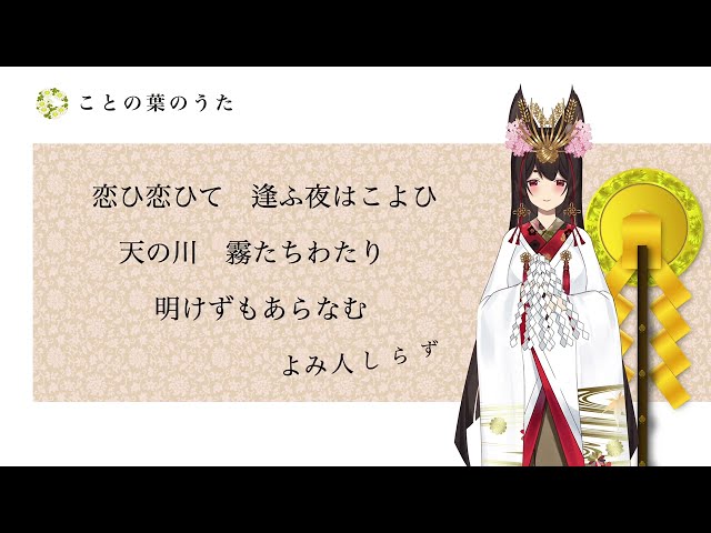 恋ひ恋ひて 逢ふ夜はこよひ 天の川 霧たちわたり 明けずもあらなむ よみ人しらず [ 首の意味 ] 首の意は、ひたすら恋い慕って、やっと逢えるのがまさしく今夜。天の川よ、一面に霧がたちこめて…