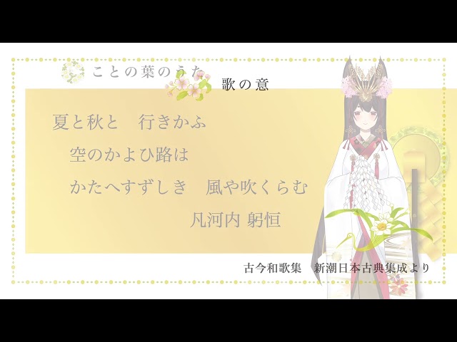 夏と秋と 行きかふ 空のかよひ路は かたへすずしき 風や吹くらむ 凡河内 躬恒 ( おおしこうちの みつね ) [ 首の意味 ] 首の意は、夏が去り、秋がやって来る空の道は、夏と秋とが行きちがって…